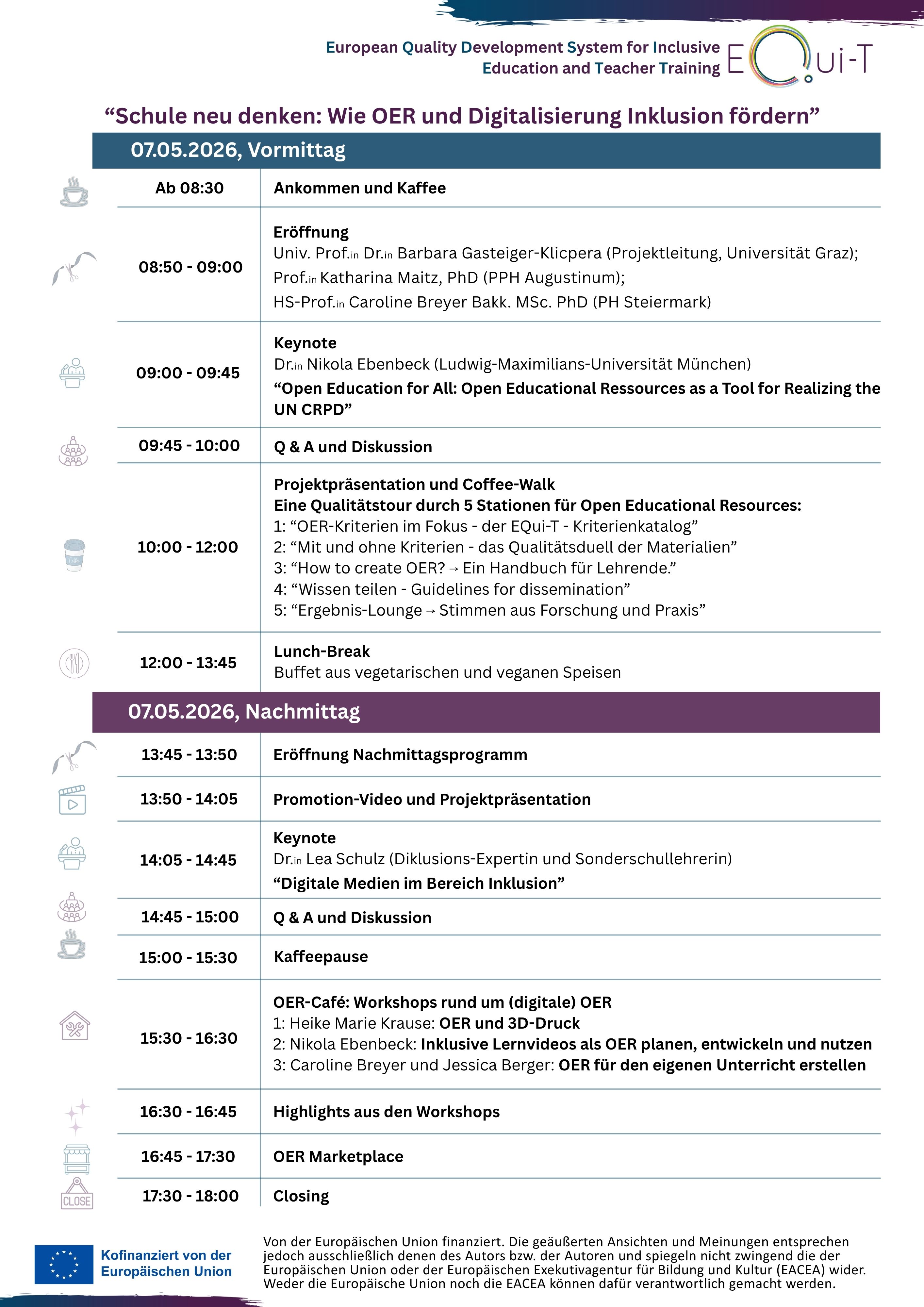 Unter dem Motto: “Schule neu denken: Wie OER und Digitalisierung Inklusion fördern” treffen wir uns am 07.05.2026 von 09:00 - 18:00 im Meerscheinschlössl, Mozartgasse 3, 8010 Graz.